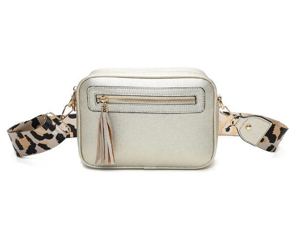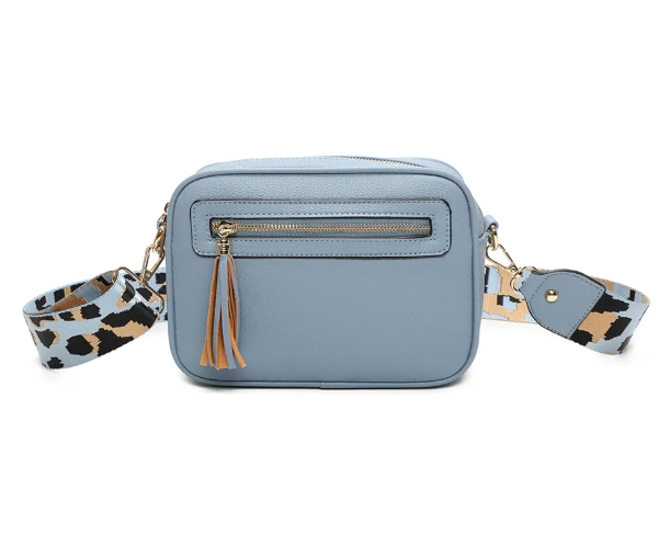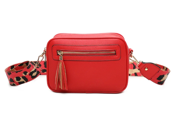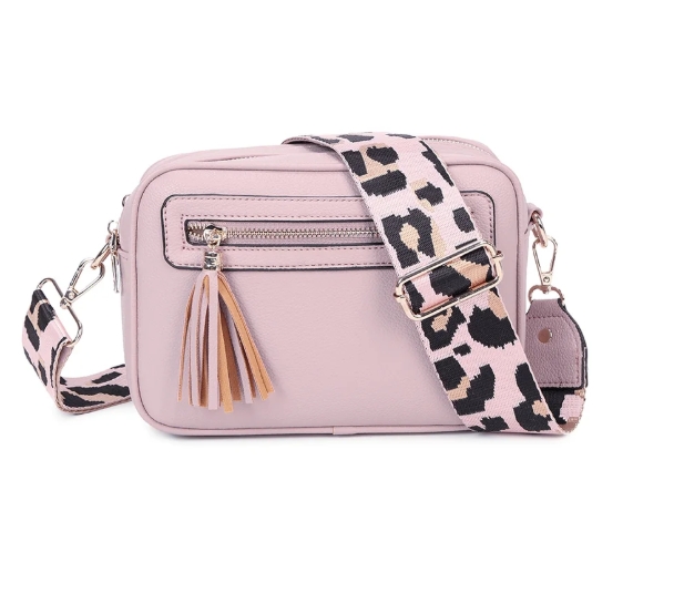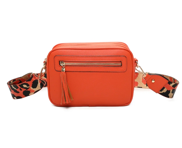 with two main zip top compartments, further front accessory zip compartment with tassel and read accessory pocket