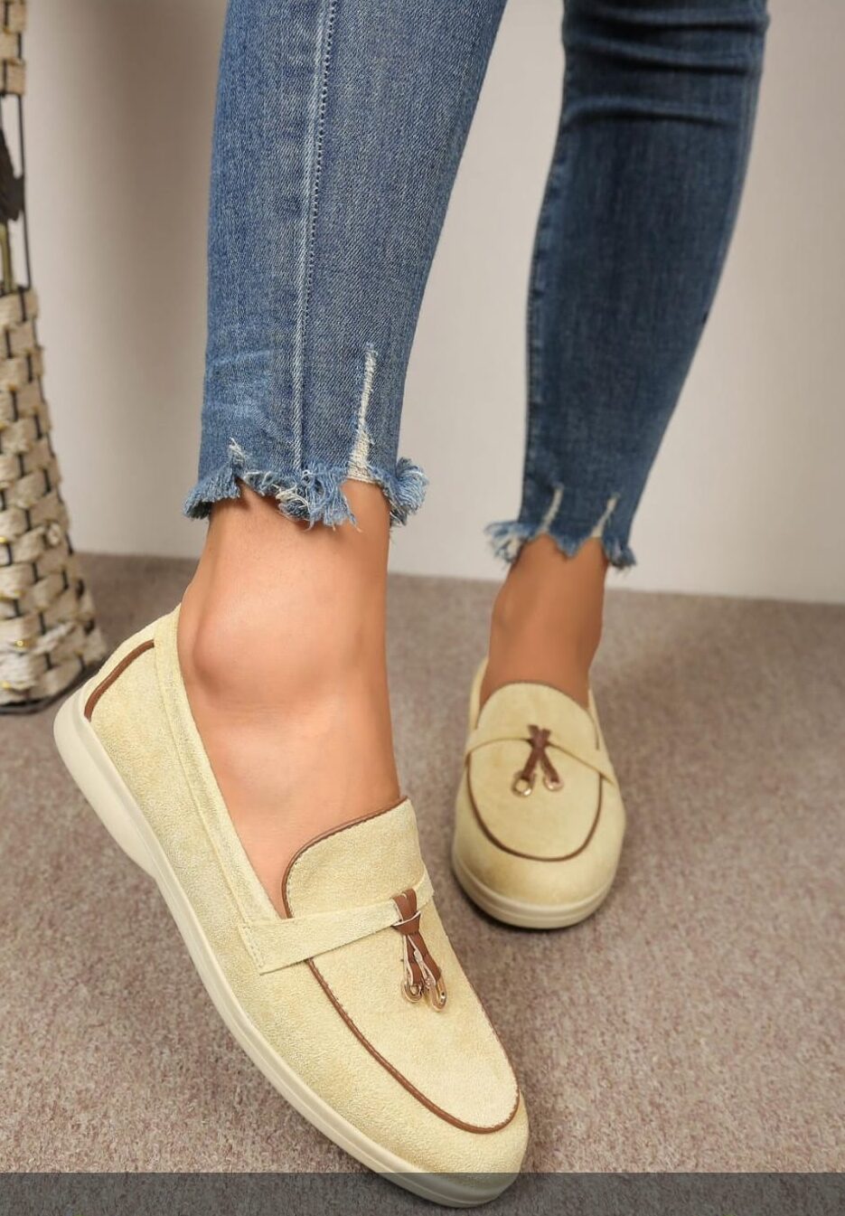 Step into effortless everyday style with these beautifully soft suede loafers. Designed in a neutral cream tone with rich brown contrast trim, they’re finished with a chic tassel detail for that timeless, polished look.