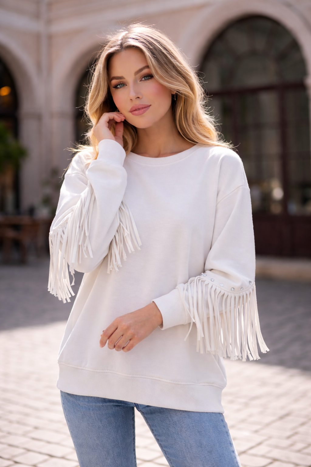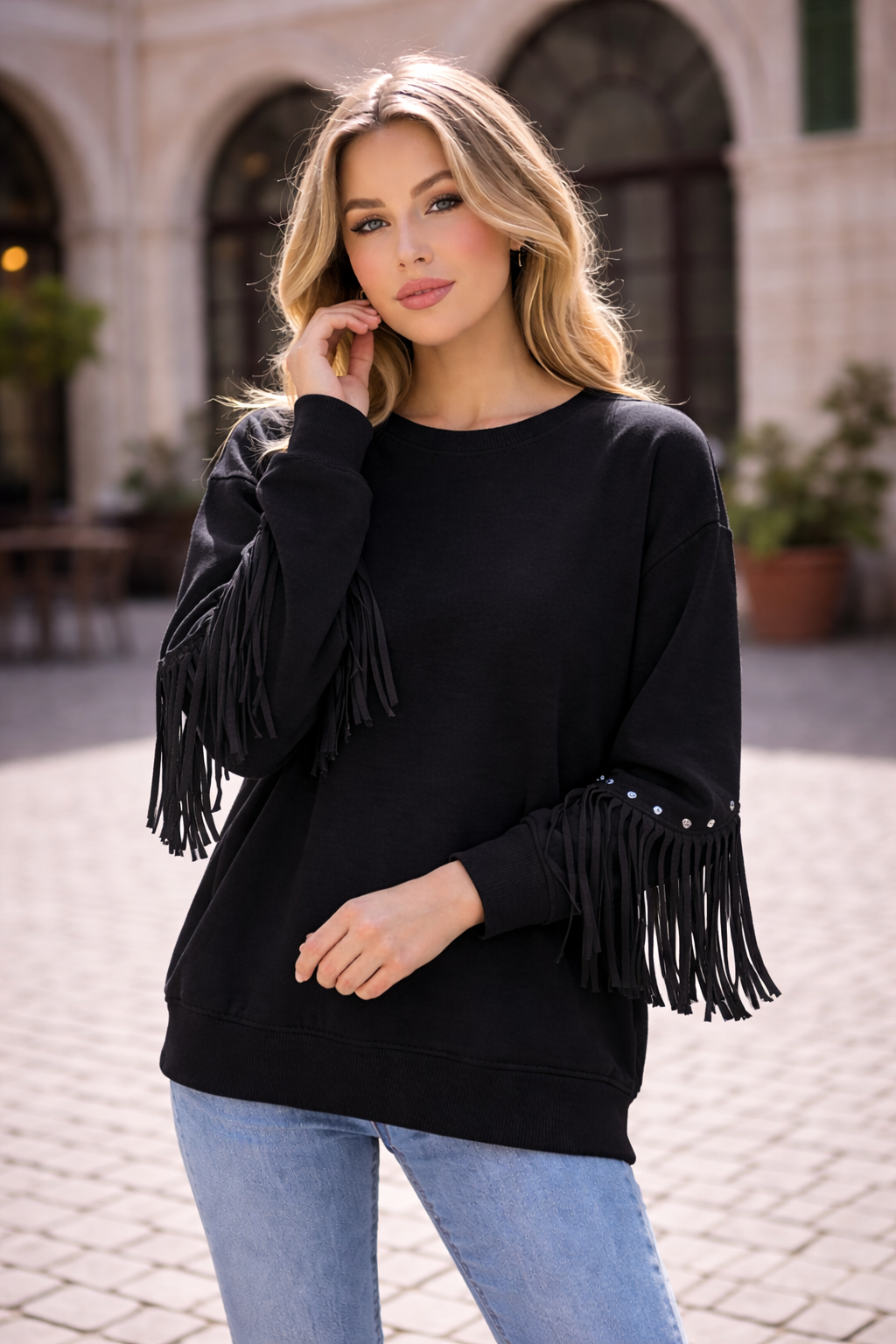 Crafted from a beautifully soft scuba fabric, this standout sweatshirt combines structure with stretch for a flattering drape that holds its shape. The smooth finish gives it that premium feel, while the eye-catching fringe sleeve detail with subtle stud accents adds the perfect touch of glam.