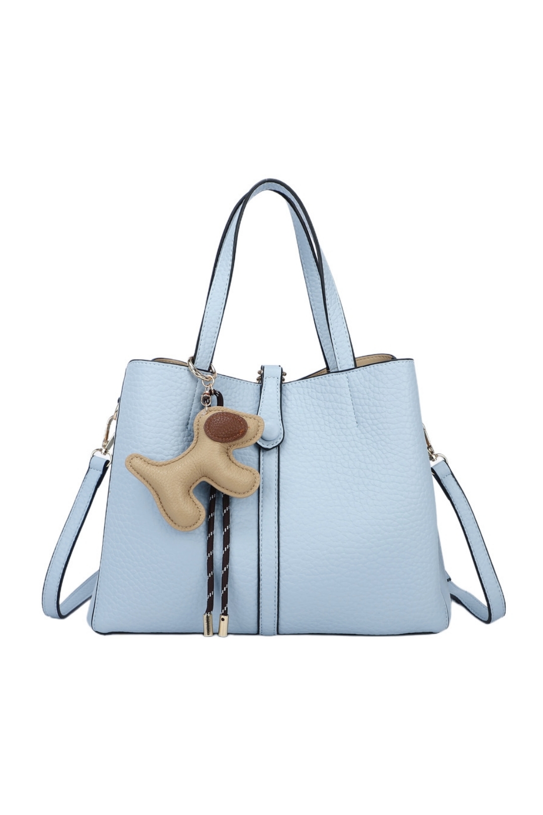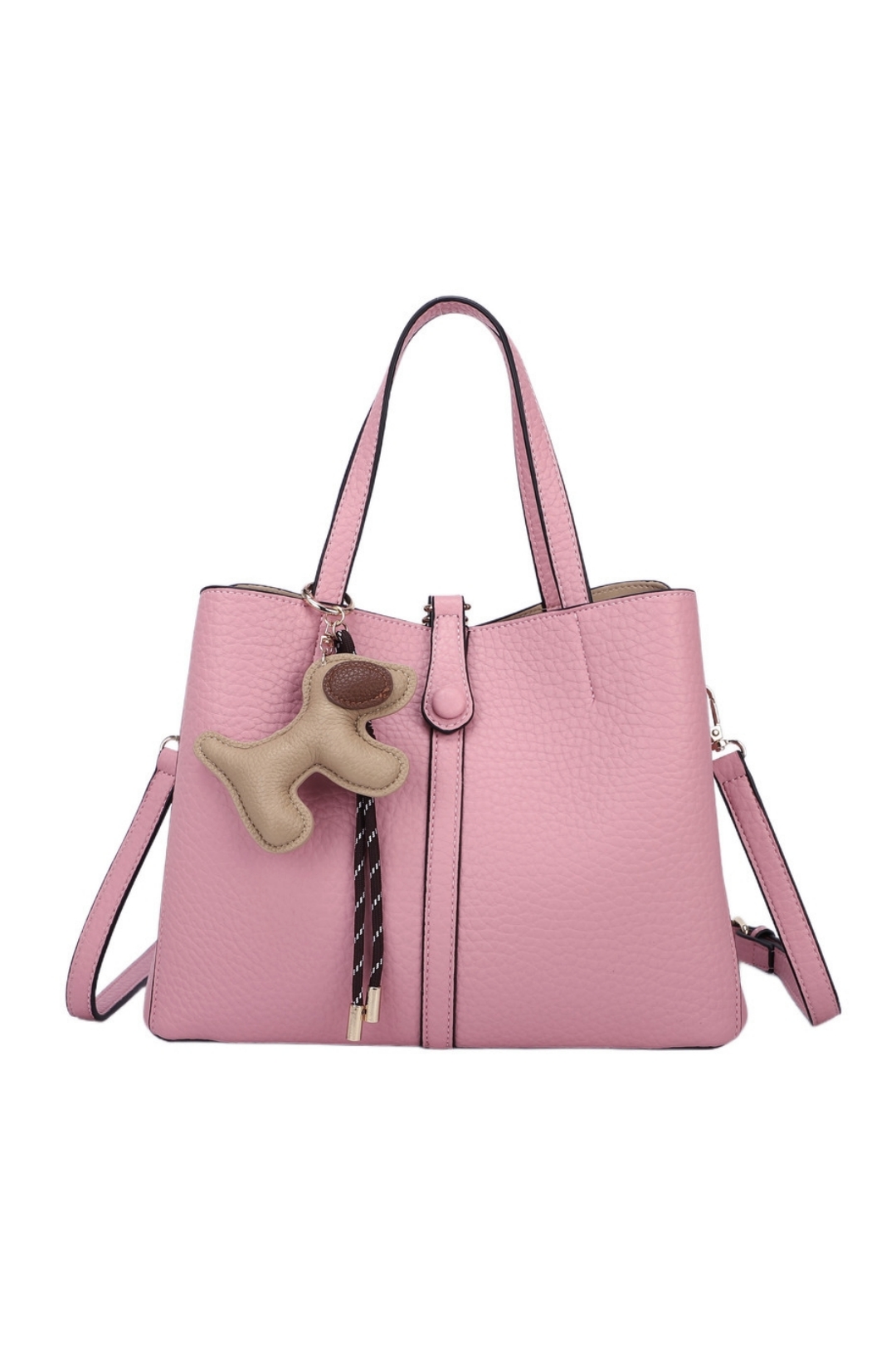 Crafted from soft faux leather with a beautiful textured finish, it features a clever middle zip compartment that creates two spacious side sections, keeping your essentials perfectly organised. The elegant clasp-over detail adds a refined touch, while the detachable bag charm brings a hint of playful personality.