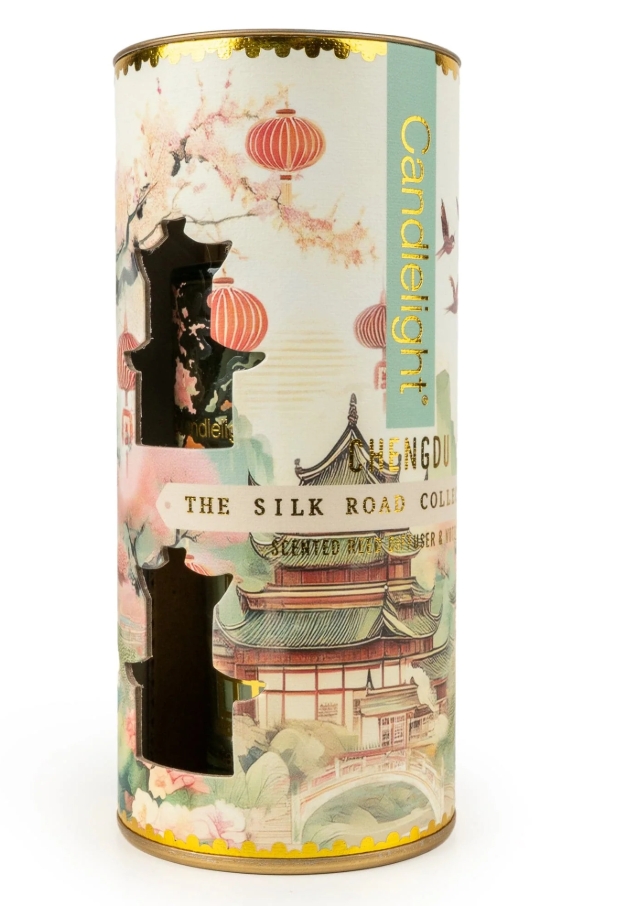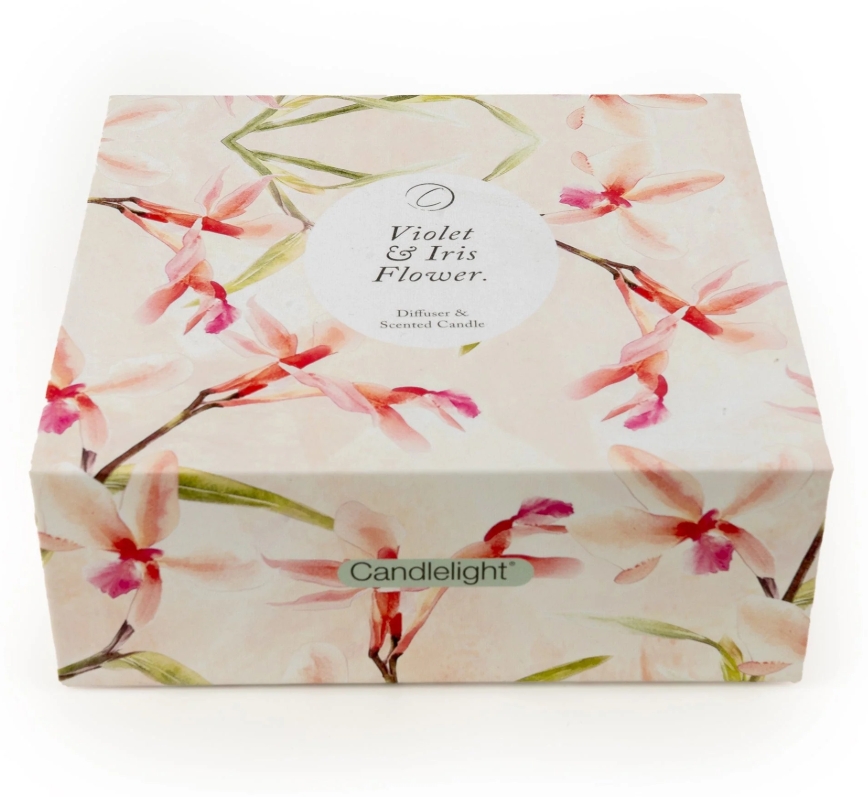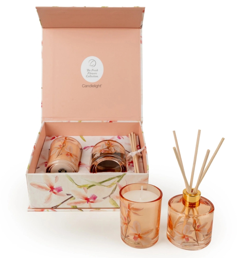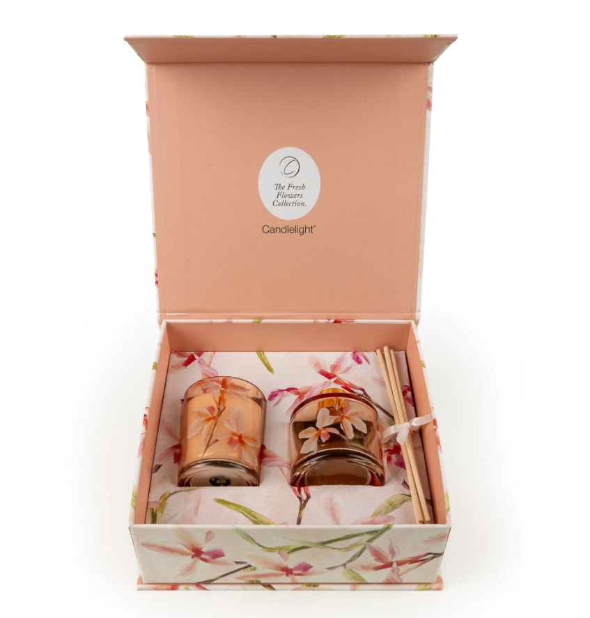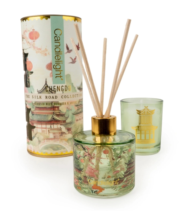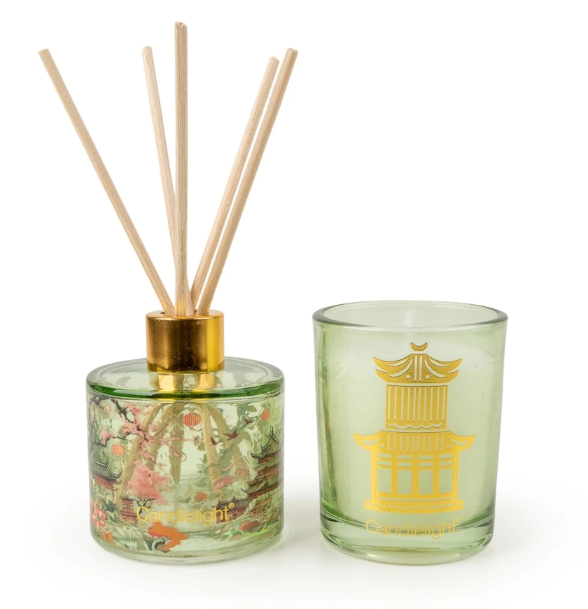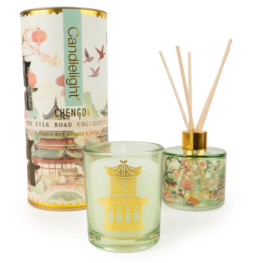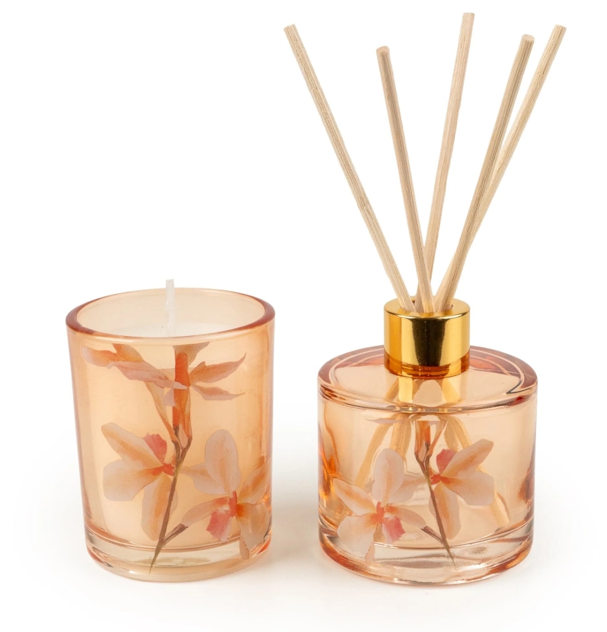a beautifully presented pairing of a scented reed diffuser and coordinating votive candle.  Housed in a keepsake giftbox with gold detailing it is instantly ready to gift. Enjoy effortless, continuous fragrance from the diffuser and a warm, atmospheric glow from the candle; afterwards, repurpose the decorative vessels as charming trinket holders