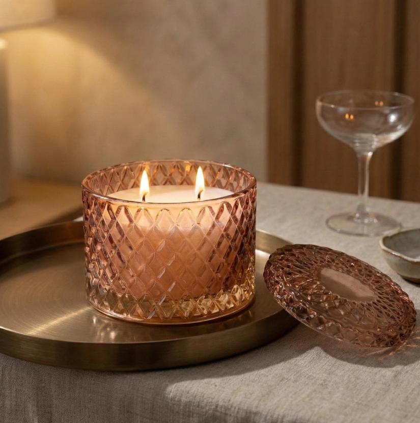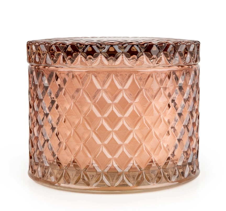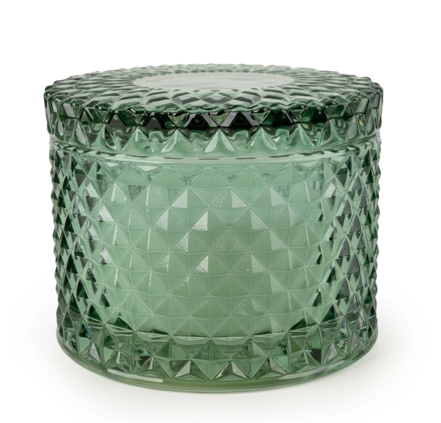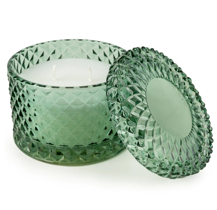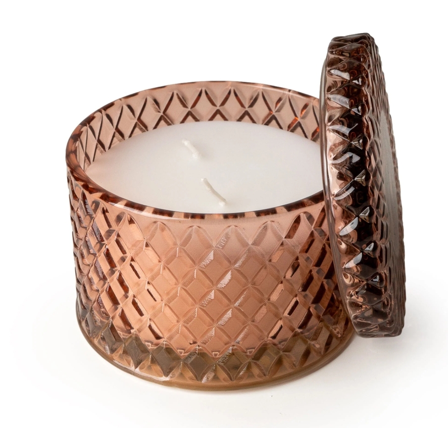 Elevate your décor with the Round Embossed Candle Jar. A beautifully cut-glass piece with a vintage diamond pattern for a luxurious, light-catching finish. The low, lidded silhouette keeps the wax pristine between burns, while twin wicks ensure a clean, even pool and a lovely glow. Perfect on a coffee table, bedside or dressing table, it’s as decorative as it is practical and once the candle is finished, the jar can be repurposed for jewellery, cotton pads or tealights. A chic gifting choice that brings elegance and warmth to any room.